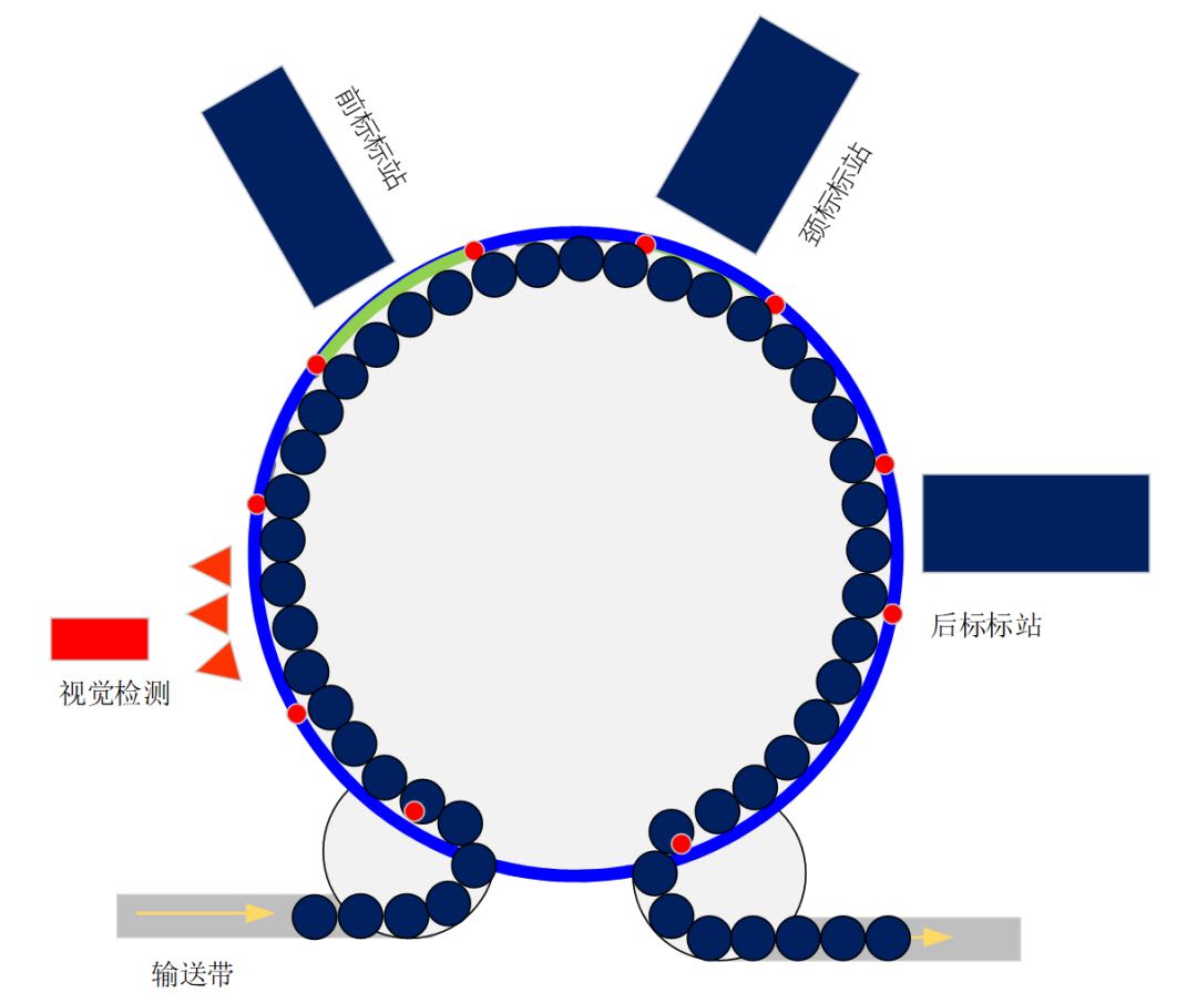 图1是回转贴标机的机械示意图,它由大圆盘及在其上的托盘、标站构成,整个托盘围绕着圆盘旋转,而贴标站可以多个,并且可以是冷胶、热熔胶、不干胶的多种形式,可以自由组合配对—根据贴标本身的需求。