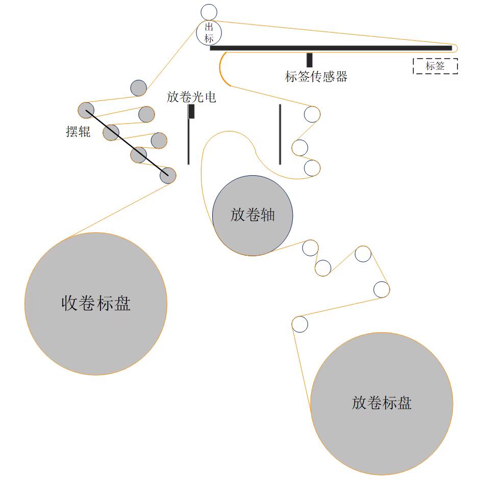 图4是送标机构的示意图,它是将标签放卷、牵引、送出、裁切的机构构成,可以由多种类型的标站,采用收放卷的高速运动控制技术来保障稳定的张力,以为精准送标、切标提供保障。