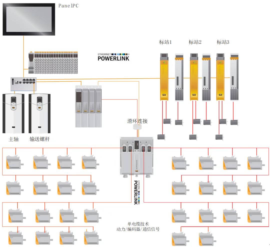 从图5整个机器的配置可以看到,多达36个伺服电机,其高速同步性,由POWERLINK实时网络来保障,达到百微秒级的任务周期。而另一方面采用ACOPOSmotor伺服驱动与电机一体的设计,也让整个接线变得更少,且空间紧凑,易于机械的安装维护。