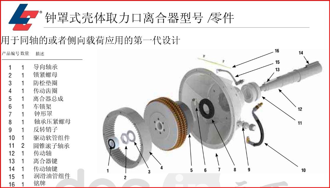 Logan气/液驱动 钟罩式壳体取力口离合器式自调节的,设计成直接安装到柴油发动机或者汽油发动机的飞轮上。摩擦圆盘组为干式应用设计。通过一个固定的缸套-活塞布置或者通过内置轴和离合器油道来完成。离合器的传动轴通过内孔或键槽来安装。扭矩从盘片组传递到安装在发动机飞轮上的齿轮传动齿圈上。Logan离合器主杠加压, 推动活塞夹紧或锁住摩擦片或分离钢片。当压力移走, 回位弹簧使摩擦片和钢片分离, 当钢片和摩擦片分离后, 可以保持运行间隙。
