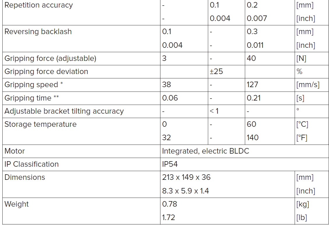 Onrobot是全球领先的电动夹爪生产厂家,公司为全球协作机器人-Universal Robot 研发即插即用的电动夹爪,所有产品均取得了UR+认证。主要产品有RG2和RG6,是和Universal Robot配合度最好的自适应电动夹爪系列,所有夹爪安装方便,编程简单,灵活使用,安全等级高,是UR机器人真正的得力“助手. RG2,GR6电动手爪主要独特特点: 1.被爪物体绝对宽度值实时读取和反馈; 2.夹爪可以安装在空间0~180度范围内任意30°分度上,单双夹爪均可; 3.可以自动计算抓取负载值,而且夹取力实时反馈,可以自动计算抓取工具中心点; 4.抓取有效与否实时反馈; 7.带深度反馈功能,平面上抓取工件编程简单; 5.支持UR3上无限循环使用; 9.UR+认证及与UR机器人外形适配性强。